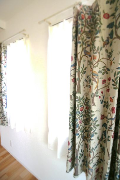 同じお部屋の東側の窓には、ウイリアムモリスの印象的な柄のドレープを。 カーテンレールも南側と変えてあります。