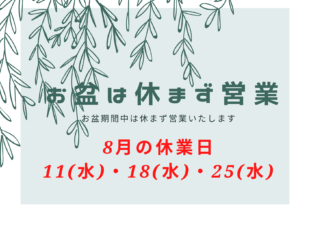 いつもご来店いただき誠にありがとうございます。お盆期間中は休まず営業しております。…